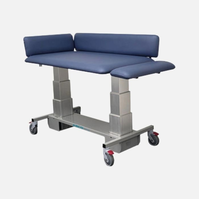 The table uses twin electric lifting columns to raise or lower the surface using a foot control. This design removes the forward movement common in swing-arm lifting systems and maintains stability throughout the height adjustment.