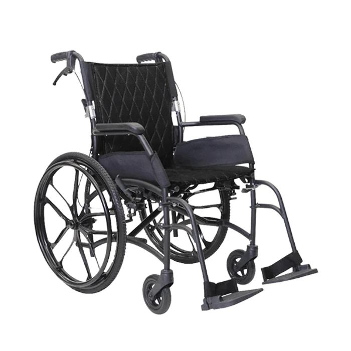The wheelchair features sporty 22-inch mag wheels, an eye-catching frame in 2 colours, & contemporary upholstery detail. The VIDA X is also foldable and lightweight due to the aluminium frame.
