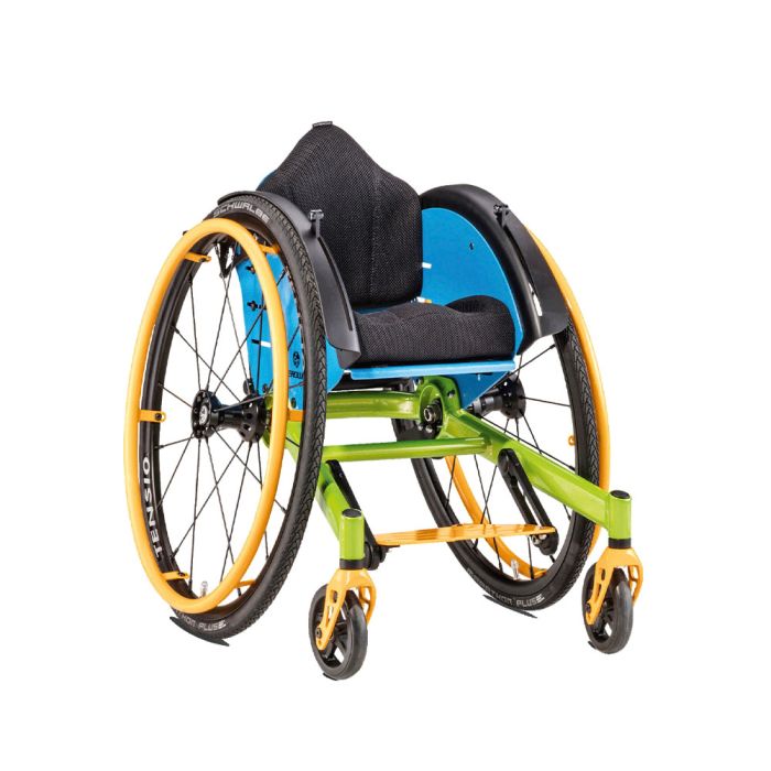 Available in attractive Duo-Colour or Tri-Colour HighLine designs, the wheelchair includes vibrant coloured seat and backrest upholstery, matching footplate, and handrims.