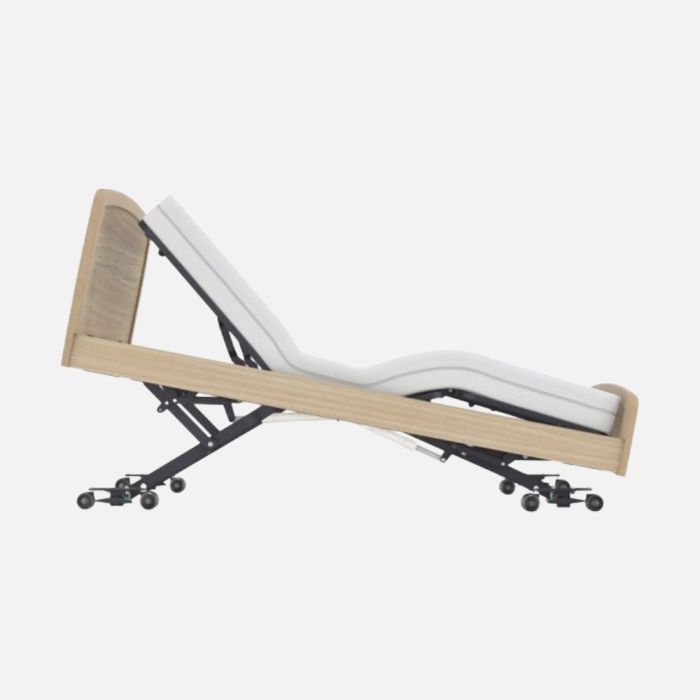 The bed includes backrest elevation with auto regression, knee break and multiple positioning functions including Trendelenburg and anti Trendelenburg. These functions support pressure management, comfort and improved positioning during daily care.