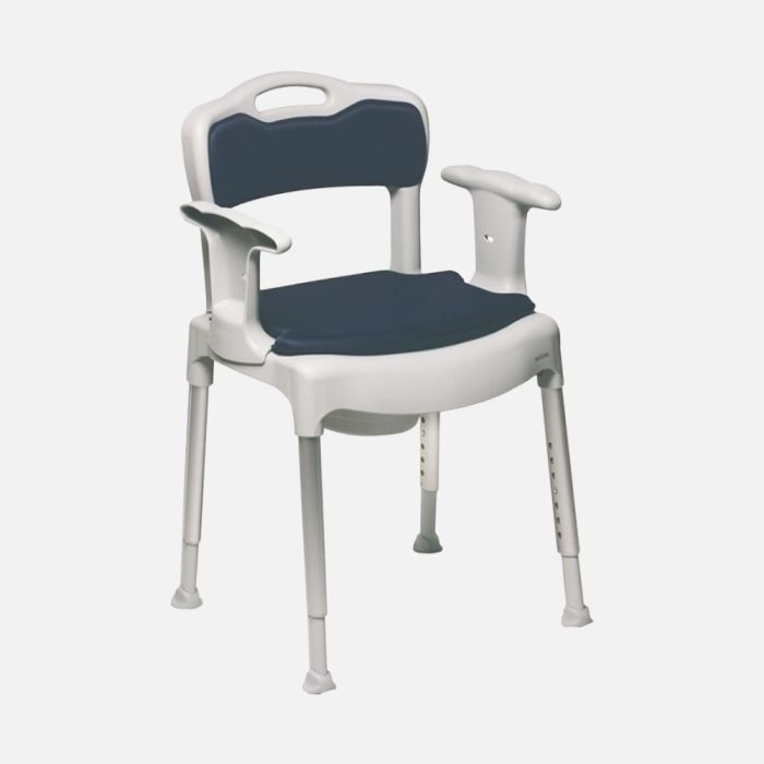 The chair is designed for comfort and safety, with a slight forward tilt option to assist with sitting and standing. Its lightweight frame and tool-free assembly make it easy to adjust, transport, and maintain.