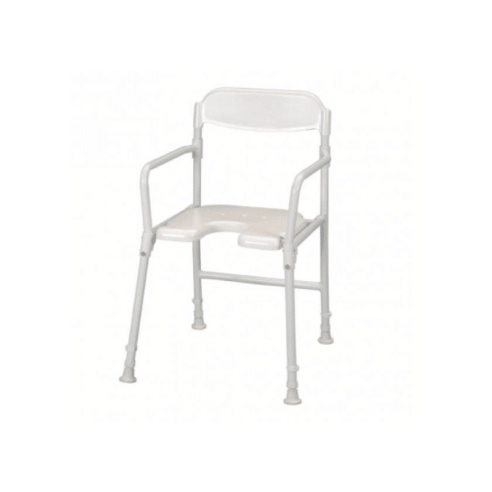 The Folding Shower Chair is designed to optimise limited bathroom space. Featuring a lightweight aluminium frame with a moulded plastic seat, it offers height-adjustable legs with non-slip feet for stability. The chair folds easily for storage and transport and includes side arms to assist with transfers, supporting up to 130kg.