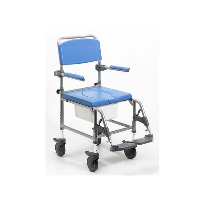 The Homecraft Atlantic Wave Deluxe Shower Commode, 18", Attendant Propelled with Adjustable Height features a lightweight, silver painted aluminium frame, which provides a rust free, high strength product. Brakes on all four wheels for security, the swing away, detachable footrests offer comfort and support whilst being transported and the armrests can be flipped back to facilitate side transfer.