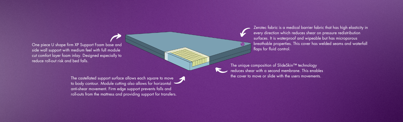 The castellated foam design allows the surface to contour to the body while reducing shear forces during movement. The two layer construction provides a balance of support and comfort, with firm edge support to assist transfers and reduce roll-out risk.