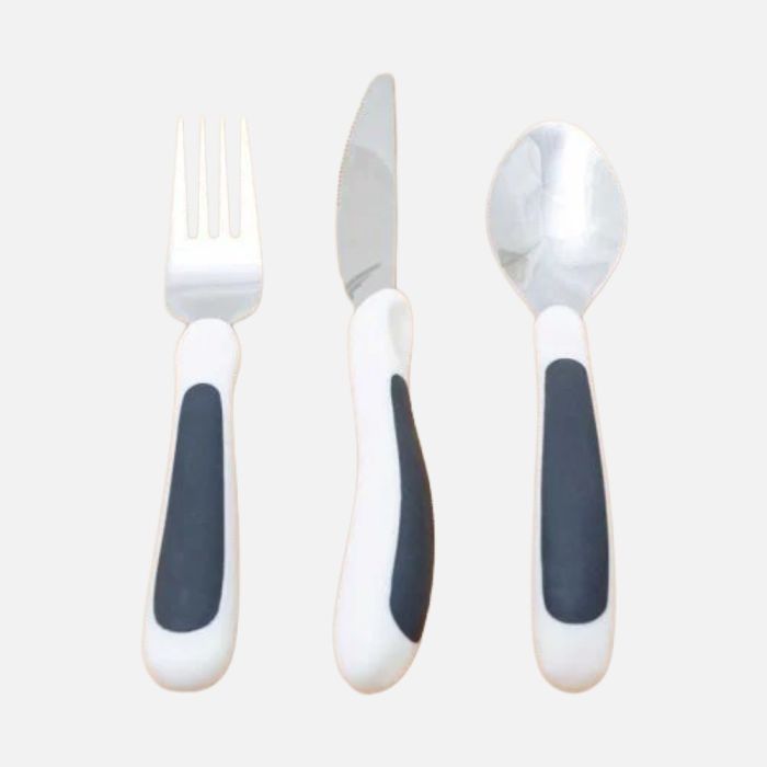 The set includes a knife, fork and spoon made from stainless steel with latex free handles. The knife has a refined cutting edge, while the fork and spoon are shaped to assist guided movement. Dishwasher safe.