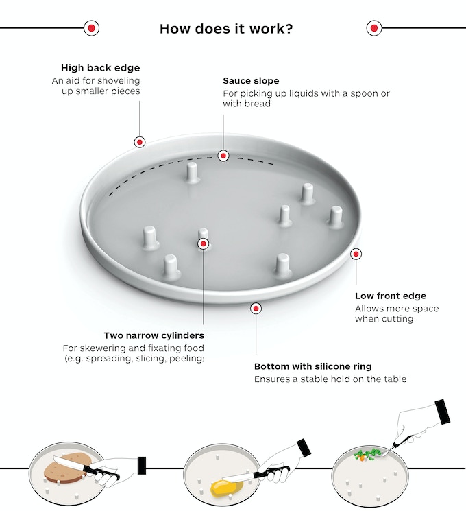 A high rear edge provides resistance when pushing food onto a fork or spoon, while the lower front edge creates space for cutting and preparing food. Integrated narrow cylinders allow food to be stabilised for slicing, spreading or peeling using one hand. A dedicated sauce slope channels liquids toward the utensil for easier collection.