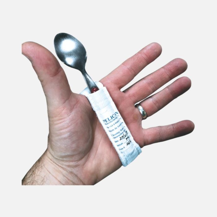 The elasticised band wraps around the palm and includes a pocket to secure a spoon, fork, toothbrush, pen, or pencil in place.