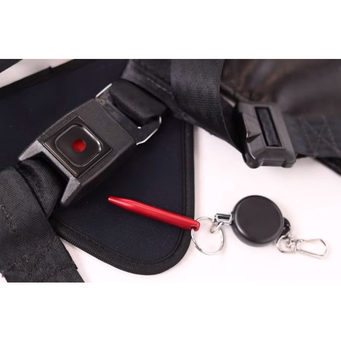 The Houdini 13 Harness Pen/key release upgrade replaces all three buckles with a mechanism that requires a pointed pen or key to open.