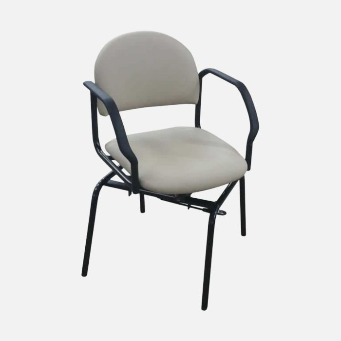 The seat rotates and slides forward to support transfers and seating alignment. The fixed legs maintain stability while the user moves into position.