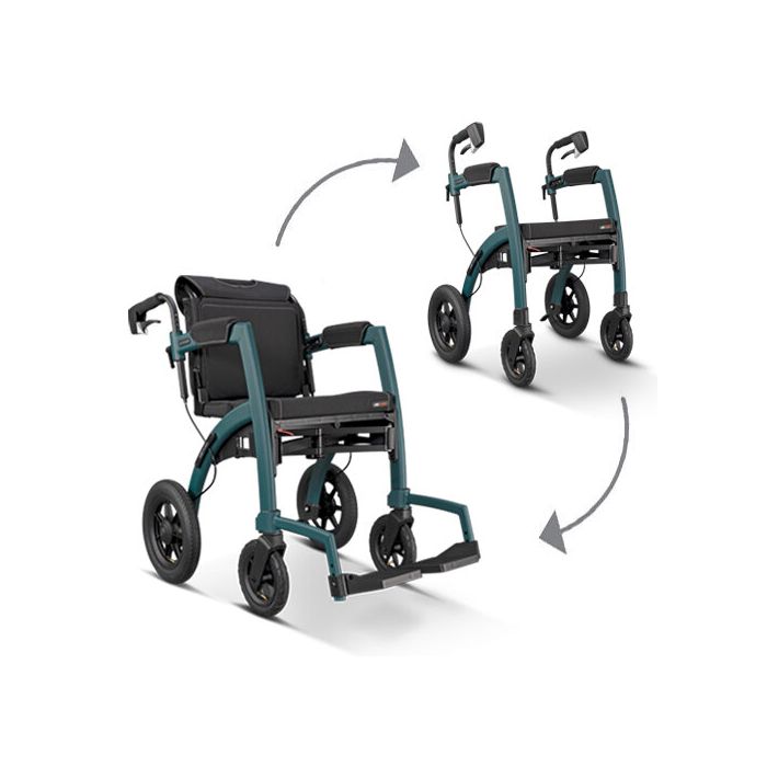 An award-winning and beautifully designed rollator / walker/ walking frame that converts simply into a wheelchair in seconds.