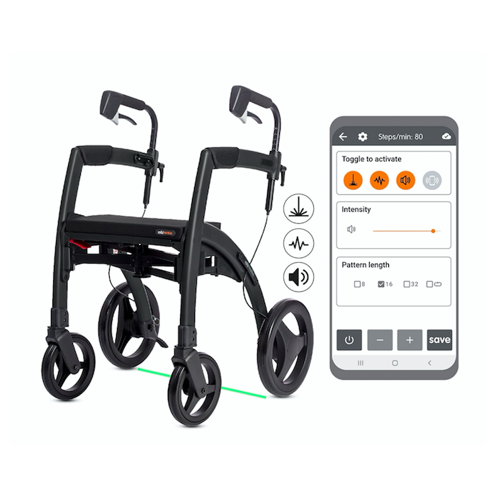 This rollator walker is meant for people living with specific neurological diseases such as Parkinson’s. Multiple stimuli are available to help the user take the first step, make subsequent steps, or maintain a walking rhythm.