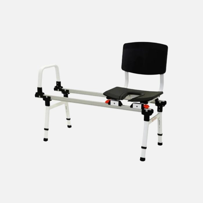 The Showerbuddy ShowerGlyde Bath Transfer Aid is a sliding transfer bench designed to assist users moving in and out of the bath safely. It reduces the risk of slips and falls by allowing the user to transfer across the tub on a stable seat. The system is available in multiple configurations to suit different bathroom layouts, including spaces with adjacent toilets or vanities. Optional accessories such as swivel seats and extension legs allow further customisation for individual needs.