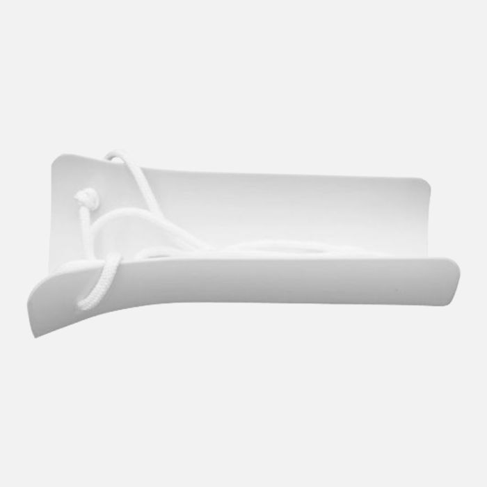 The lightweight plastic gutter holds the sock open, allowing the foot to slide in before pulling it into place using the attached cords.