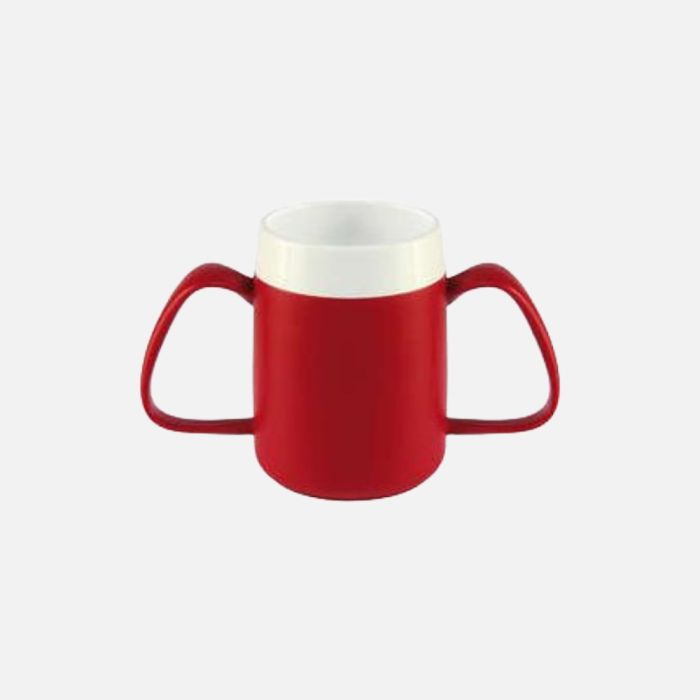 The mug features two large handles for improved grip and control, making it suitable for users with limited hand strength or coordination. A wide base adds stability to help prevent tipping during use.