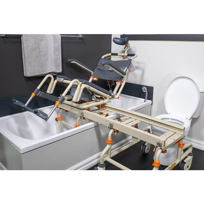 - Using the tilt release, the carer leans the user back so that the footrest clears the edge of the bathtub.